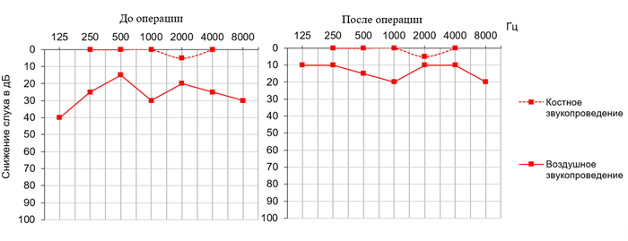 Клинический случай. М., 36 лет. В течение 2 лет отмечает снижение слуха, а также болевые ощущения при попадании воды в ухо после перенесенного острого гнойного среднего отита. До операции уровень слуха не укладывался в степень нарушения, однако был хуже, чем на здоровом ухе. Пациенту была проведена тимпанопластика I типа (Wullstein, 1968 г.) по технике overlay с рассечением рубцов барабанной полости и закрытием дефекта барабанной перепонки с использованием аутотрансплантата в виде фасции височной мышцы. Послеоперационный период протекал без осложнений. Через 2 месяца на контрольной аудиометрии была получена прибавка слуха в пределах речевых частот. Если коротко, но теперь немного подробностей.
