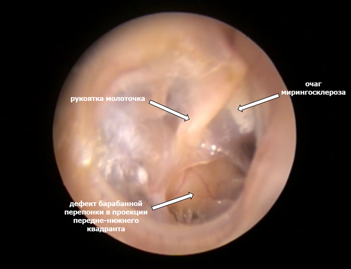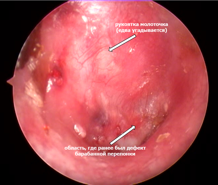 Отоскопическая картина, которую мы видим на приеме. Комментарии о необходимости операции тут излишни - надо закрывать!