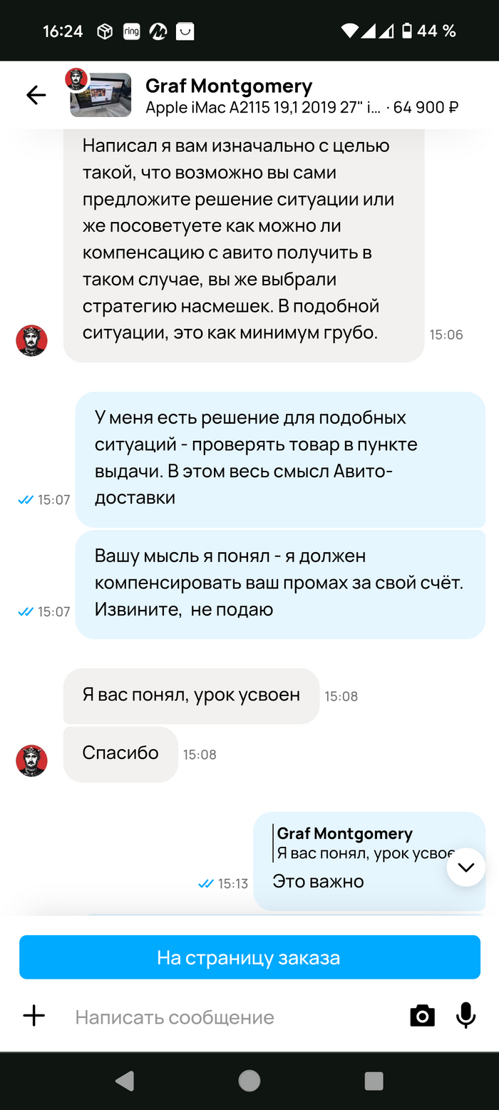 Сегодня прилетает отзыв от человека, с которым мы закончили общение недели полторы назад. Кратко - он получил, не проверяя в пункте выдачи, повреждённый в следствии доставки товар. Решил что я ему что-то должен компенсировать, разнылся в ЛС (я его понимаю, цена вопроса 65к). Ну и канул в лету. Обидно было за него, но с меня то взятки гладки.