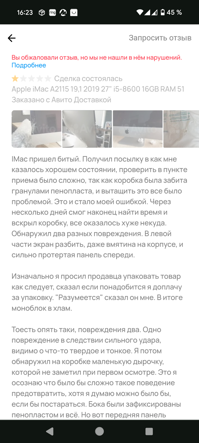 Авито не проверяет отзывы и жалобы на них (доказательство)