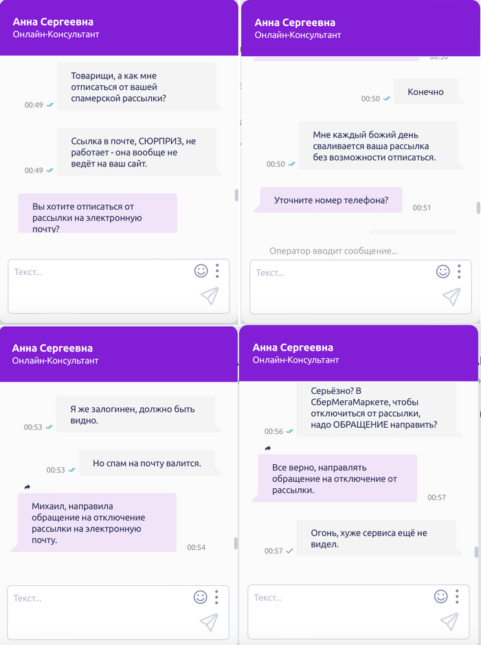 Я немного поорал с этой наглости, пошёл на сайт, нашёл чатик с техподдержкой, ещё немного поорал с её тупизны (если описать тупому боту проблему, которая не вписывается в его, бота, понимание, то он не переключит на оператора, а будет упорно требовать нажать соответствующую кнопочку), наконец попал на оператора. Ну и оказалось, что чтобы отписаться от рассылки «СберМегаМаркета», надо — внимание! — составить аж целое обращение! Вот, полюбуйтесь на переписку: