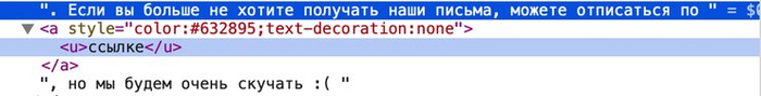 Несколько дней я письма просто игнорил и удалял, потом всё же решил отписаться — благо соответствующая ссылочка в конце письма имелась. Но не тут-то было — ссылка тупо не работает, потому что охреневшие маркетологи её, ссылку, тупо не прописали! Для тех, кто разбирается в HTML, поясню: там просто нет аттрибута HREF. Вообще. Вот STYLE — он есть, а HREF — нетути. Вот, полюбуйтесь на код этой прелести: