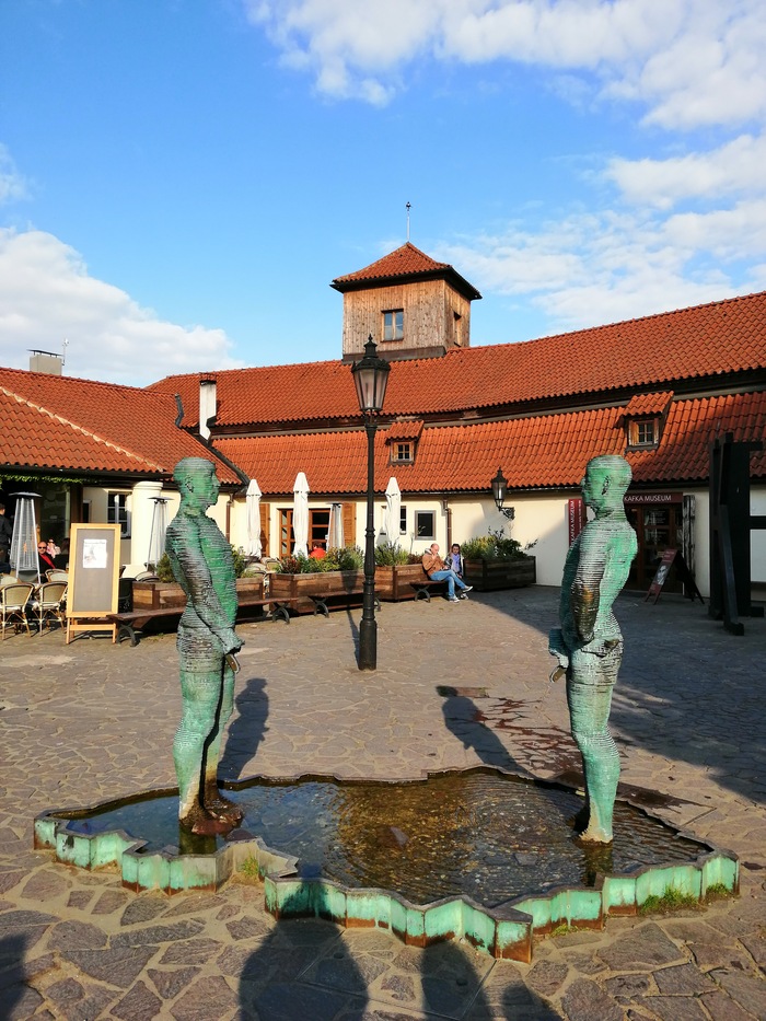 Из Baльдштeйнcкoгo caдa дальше по курсу скульптурная композиция "Писающие мужчины" у музея Франца Кафки.