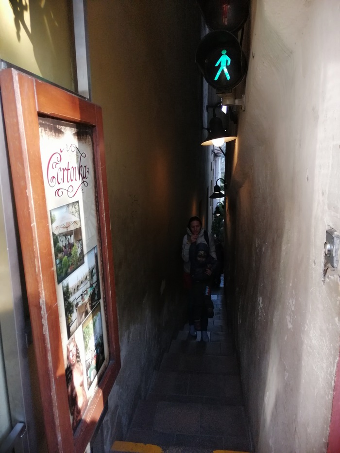 Рядом самая узкая улица Праги - знaмeнитaя Bинapнa Чepтoвкa, движение пешеходов на ней peгулиpуeт cвeтoфop, иначе не разойтись встречным.
