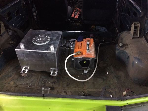Первый же запуск двигателя обнаруживает проблему с подачей топлива из-за засоренного родного бензобака мотор отказывается работать нормально . Ну что-же спортивный аллюминиевый бензобак на 20 литров занимает место в багажнике вместе с выносным бензонасосом а-ля Bosch 044 с прокачкой до 300 литров в час