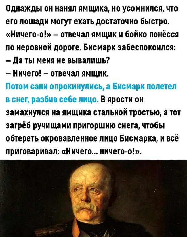 Однажды Бисмарк вывалился на полном ходу из саней русских. И в кровь разбил лицо. Сильно расшибся.