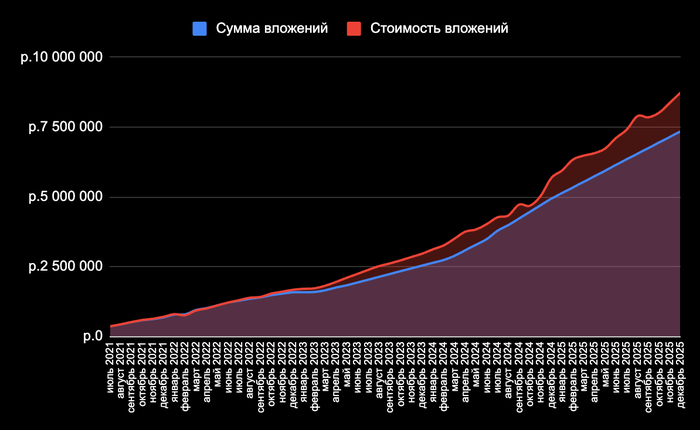 В декабре удалось пополнить портфель на 200 000, 2,4 млн за год. План выполнен на 100%. На 2026 год ставлю план min–max 1,2–2,4 млн. Нужно кубышку пополнять, да и отпусков много зимних запланировано.