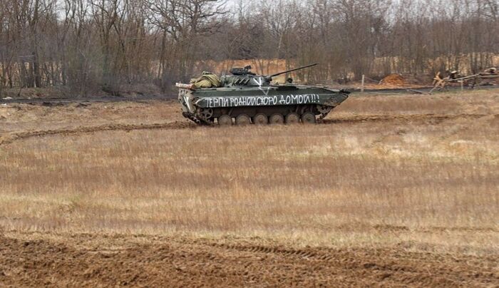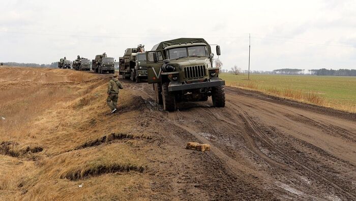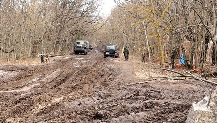 Мы оказались в лагере, откуда часть солдат «выходит» из горячей точки для отдыха, другая часть их меняет и «заходит». То же самое происходит с техникой. Подбитые танки, автомобили вывозят на тралах, отремонтированная техника и новая заезжает. Вся российская техника без номеров. Отличительная черта только буквы «V» на бортах. Очень много тралов (как раз для вывоза подбитой техники) с белорусскими номерами.