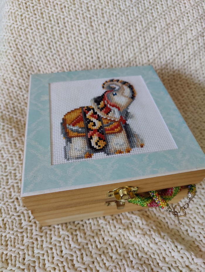 Слоника вышивала по набору Сделано своими руками. Шкатулку покупала лет десять назад для освоения техники декупаж. Но не сложилось. А тут звёзды сошлись. Ну, и скрапбумага нашлась подходящая