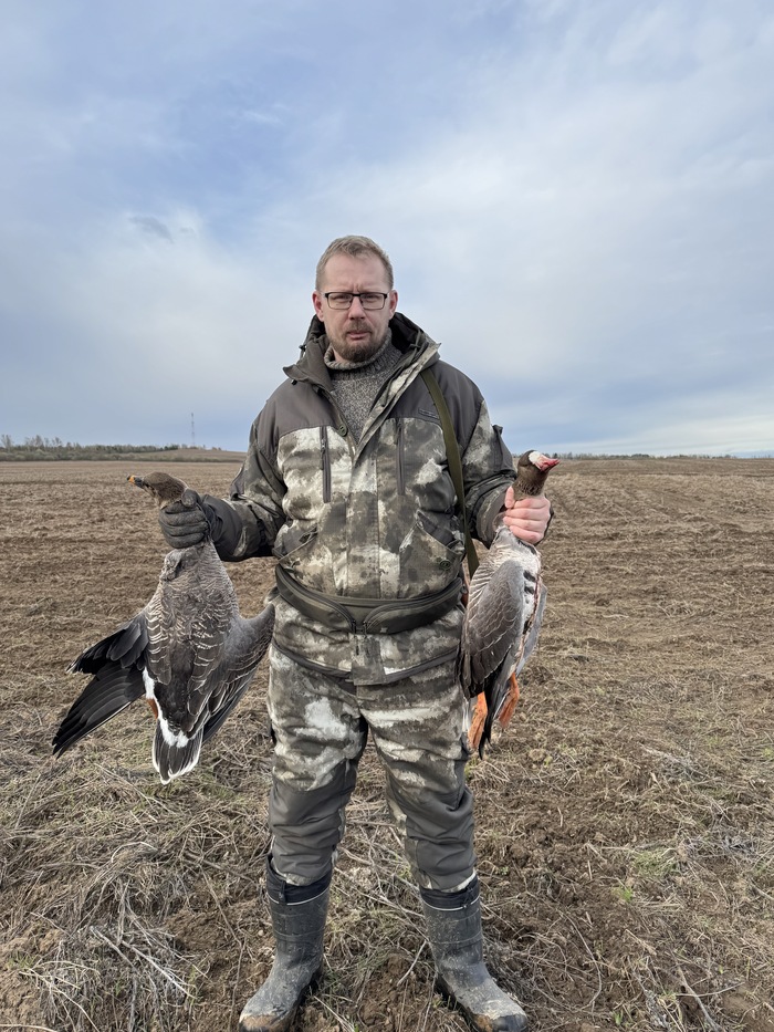В очередной день вооружённый наставлениями Николая Михайловича и своей двустволкой я один остался ожидать гусей, в то время как остальные охотники ушли обедать. Отсутствие лесов, лесопосадок и холмов даёт возможность издалека замечать подлёт гусиных стай в этом регионе. Но всё же появление огромной гусиной стаи на горизонте показалось для меня неожиданной. Гуси летели как бы мимо нашего садбища, но затем они вдруг начали плавно изменять маршрут и стали постепенно приближаться. После ожидания в несколько дней это казалось невероятным! Гуси явно заметили наши профиля уже точно держали курс прямо на нашу полянку. Ну надо же, как раз когда все ушли! Эх, был бы хоть кто-то, кто сумел бы подманить гусей манком или «голосом» как Николай Михайлович. А ну как, вдруг стайка сейчас отвернёт и улетит? Но гуси не улетали, а приближались всё ближе и ближе.