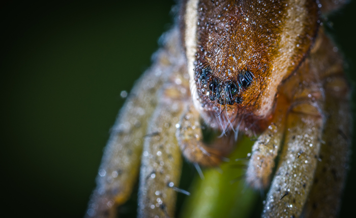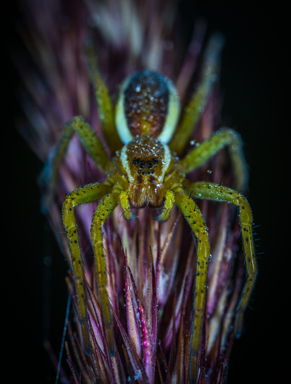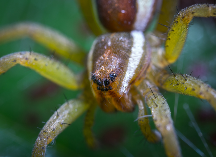 Перед нами портрет доломедеса (Dolomedes fimbriatus) или охотника каёмчатого. Я сделал его на болотистой поляне поздним вечером.