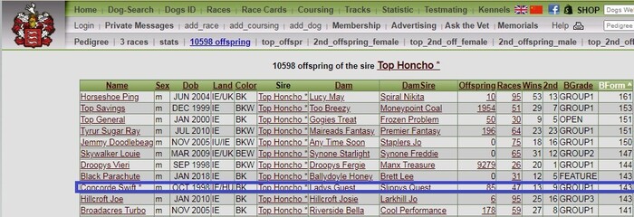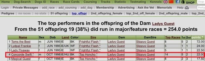Конкорд Свифт (GD рейтинг – 143) входил в топ-10 потомков небезызвестного Топ Хончо (Ирландия), становившегося с 2002 по 2009 годы лучшим производителем в Ирландии и в топ-5 потомков Леди Гэст (Ирландия), родившей множество супер-бегунов.