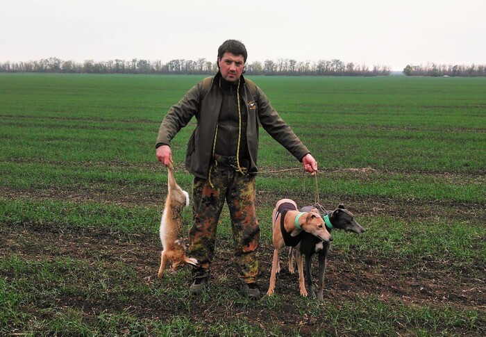 На фотографии: Собенников Д.Б. с добычей, Кабул, Кантабрия, октябрь 2022 года, Целинские районные испытания по зайцу-русаку.