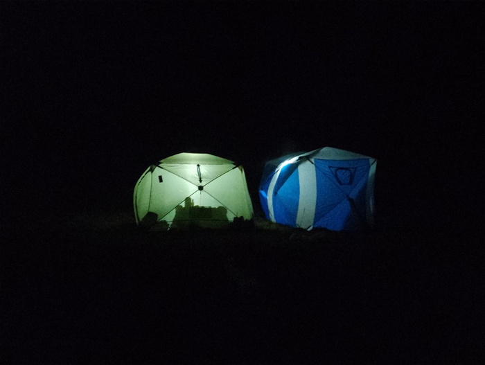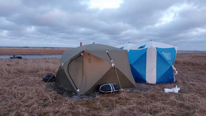Тут мы быстренько разбили лагерь и поехали вверх по реке Амчигаче устанавливать скрадки (укрытия) для охоты - ведь завтра 1 мая - день открытия охоты.