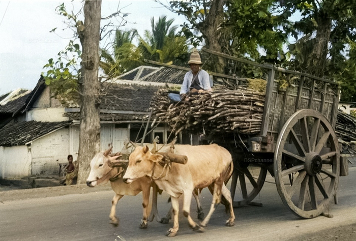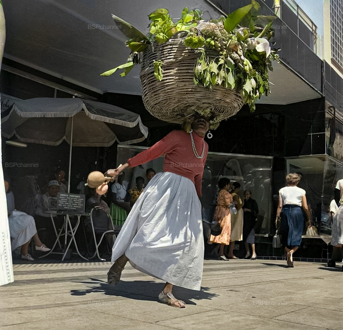 Такой способ ношения груза, сочетающий практичность и грацию, был распространён в Карибском регионе и отражал как местные традиции, так и культурное наследие африканских и индийских общин, населявших остров. Порт-оф-Спейн в середине XX века — город, где переплетались колониальное прошлое, тропическая повседневность и нарастающее стремление к независимости (Тринидад обретёт её в 1962 году).
