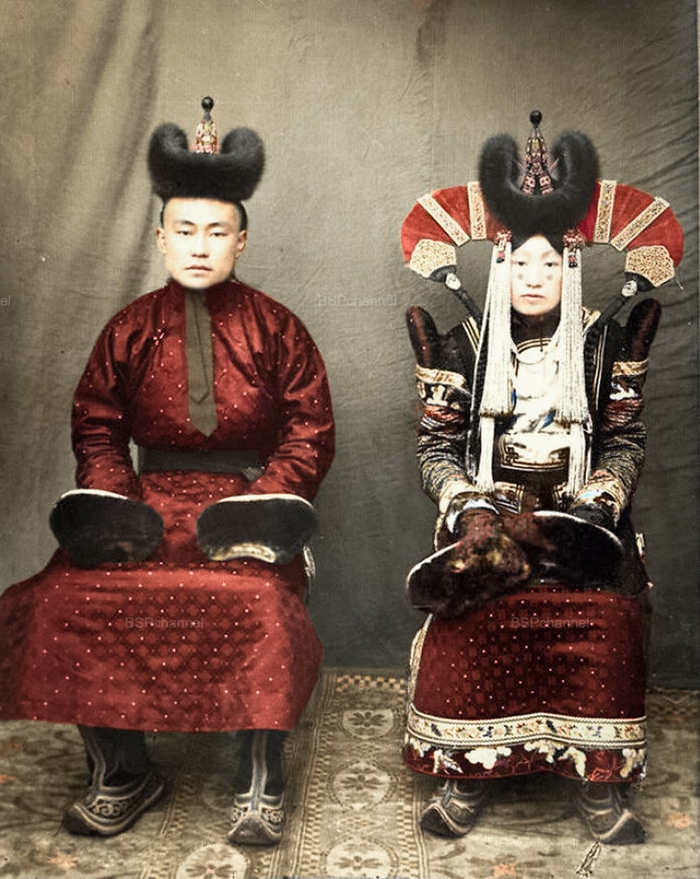 Супружеская пара в традиционных монгольских костюмах. Монголия, 1920-е годы.