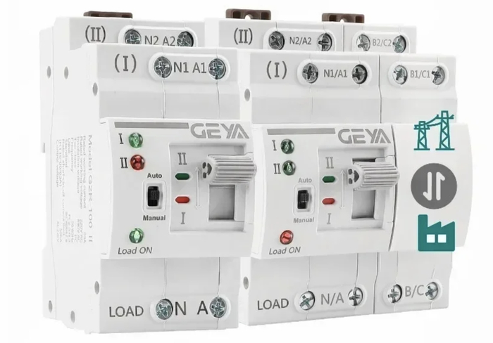 Автоматический переключатель GEYA G2R предназначен для организации резервного электропитания в однофазных сетях 220 В. Устройство автоматически отслеживает наличие напряжения на основной линии и мгновенно переключает нагрузку на резервный источник при аварии. Такая схема позволяет защитить оборудование от внезапного отключения и потери данных.