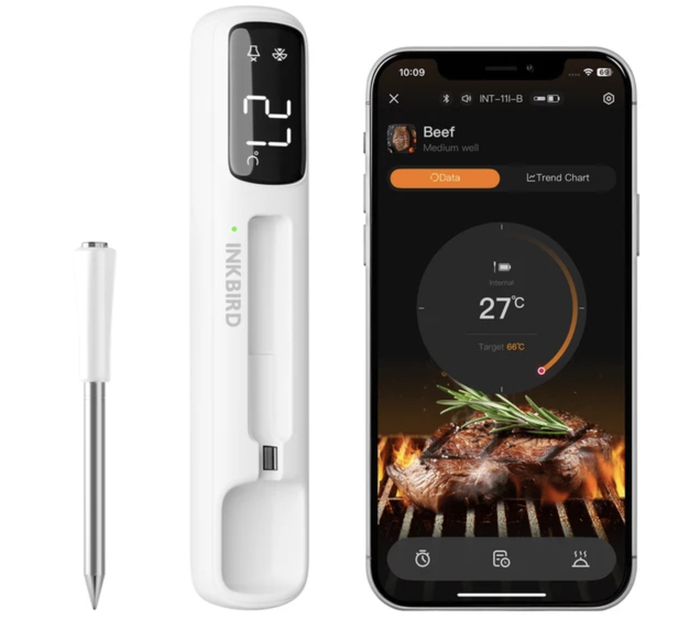 Беспроводной термометр INKBIRD INT-11I-B предназначен для точного контроля температуры при приготовлении мяса. Устройство позволяет следить за процессом через приложение без постоянного присутствия у плиты или гриля. Высокая точность измерений помогает добиться желаемой степени прожарки.
