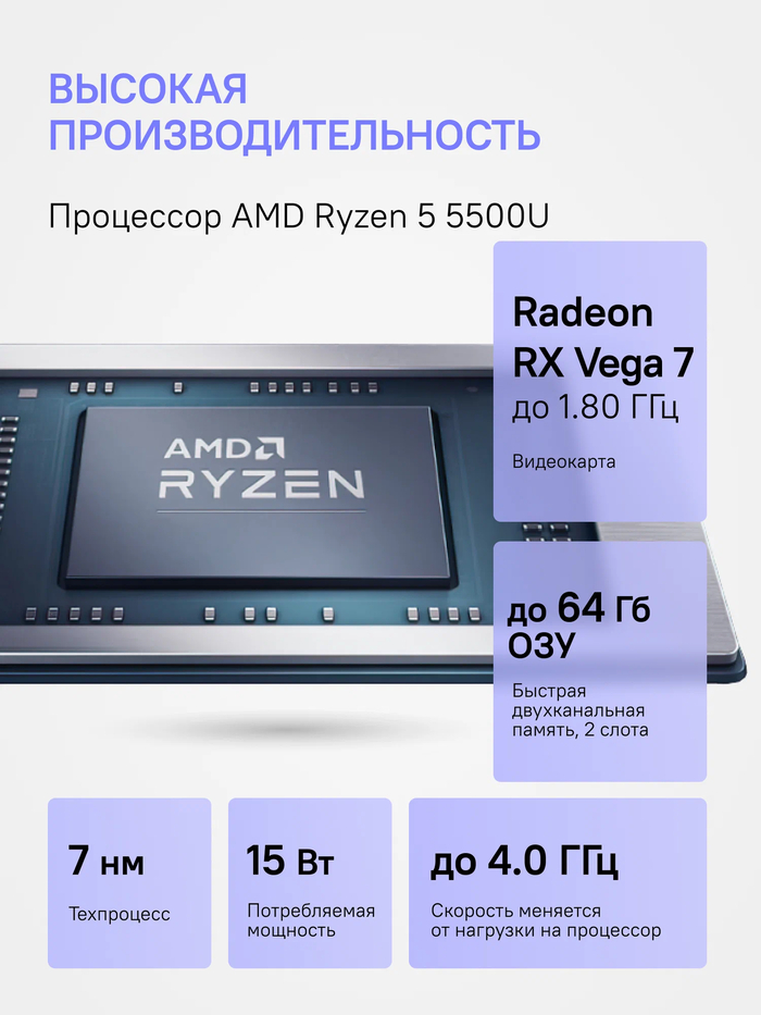 Основа вычислительной мощности ноутбука — шестиъядерный процессор AMD Ryzen 5 5500U с интегрированной графикой Radeon Vega 7. Процессор построен на современной архитектуре Zen 3 и произведён по прогрессивному 7-нм техпроцессу, что обеспечивает высокую эффективность и низкое энергопотребление. Графический ускоритель справляется с базовыми графическими задачами, включая просмотр фильмов высокого разрешения и лёгкую игровую графику.