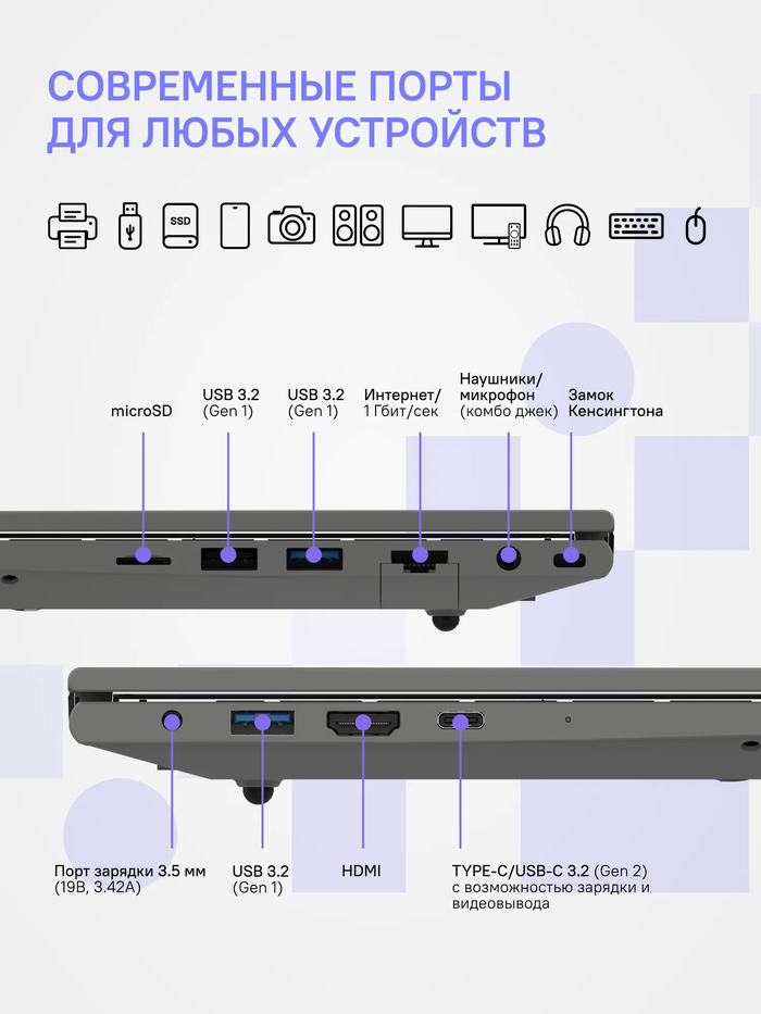 Модель оснащена широким набором интерфейсов: три порта USB-A 3.2, порт USB-C 3.2 Gen 2 с поддержкой быстрой зарядки Power Delivery, полноразмерный HDMI 1.4, слот microSD для карт памяти, сетевой разъём RJ-45 и замок Kensington для предотвращения кражи. Эти интерфейсы предоставляют широкие возможности для подключения периферии и вывода изображения на внешние мониторы.