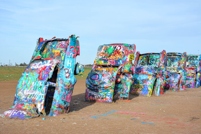 Недалеко от Амарилло есть кладбище Кадиллаков (оно же на первом фото). Какие-то ребята вкопали в землю старые машины, и теперь туристы разрисовывают их краской. Баллончик можно купить за пару долларов тут же на месте.