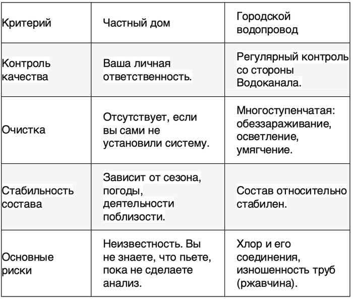 Проще говоря, в городе вы пьете условно очищенную, но контролируемую воду. В своем доме — вы пьете «дикую» воду, состав которой может быть непредсказуем.