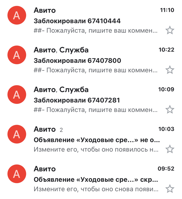 Вот целый список уведомлений в приложении, все по поводу неправильно заблокированных объявлений по причине выше.