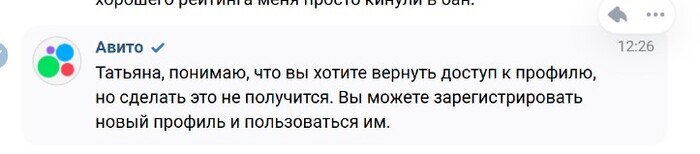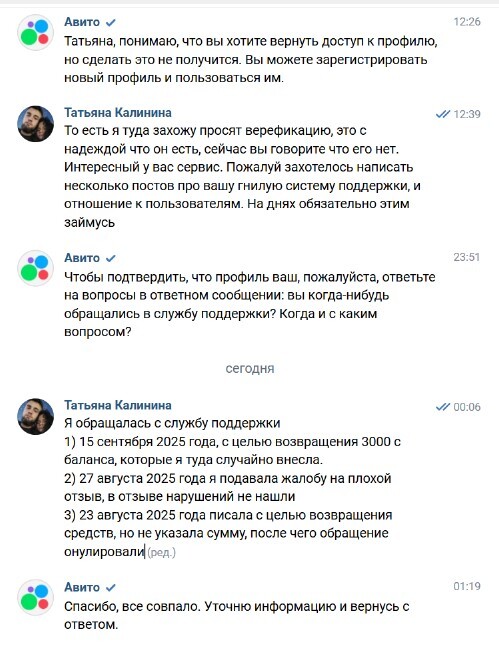 Интересный момент в чате ранее «Мне написали, что восстановить доступ невозможно, а вместо этого нужно сделать новый профиль. Но зачем, если он будет существовать ровно до первой проверки и сразу окажется заблокированным?» А буквально через день пишут пройдите верификацию и получите доступ к профилю. Где вообще присутствует логика во всех этих сообщениях от службы поддержки авито, когда вначале говорят одно, а потом резко меняются в показаниях и пишут совершенно противоположные сообщения.