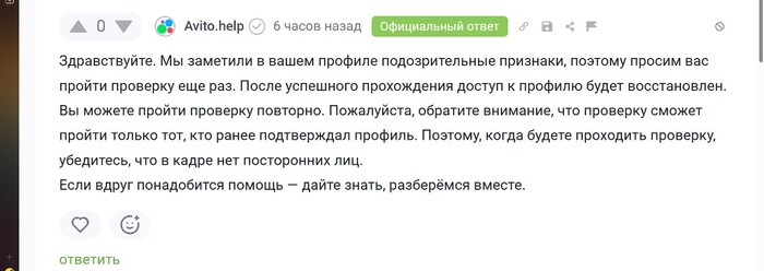 После моего поста о том, что уже 4 дня не могу пройти верификацию и из-за этого лишена доступа к аккаунту, под публикацией появилось сообщение от официального аккаунта Авито: «замечена подозрительная активность, пройдите видеоверефикацию без посторонних лиц и доступ к профилю будет восстановлен».