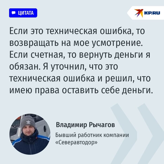 Далее был суд. Где руководитель фирмы "Северавтодор" заявил, что никакого перечисления 13-й зарплаты Рычагову не было. Организация работает в правовой системе. Юристы отмечают, что уголовного дела Владимиру не грозит, ведь речь идет о технической ошибке, но вернуть деньги он обязан. Сам Владимир не согласен с решением суда и намерен дойти до Верховного суда, благо деньги на адвоката и госпошлины у него еще пока есть.