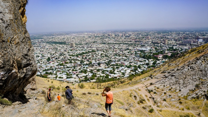 Поднимаемся выше в гору.С самого балкона открывается хороший вид на город. Впрочем, поскольку мы идем на смотровую площадку рядом с "домиком Бабура", то панорама Оша будет нас преследовать достаточно долго.