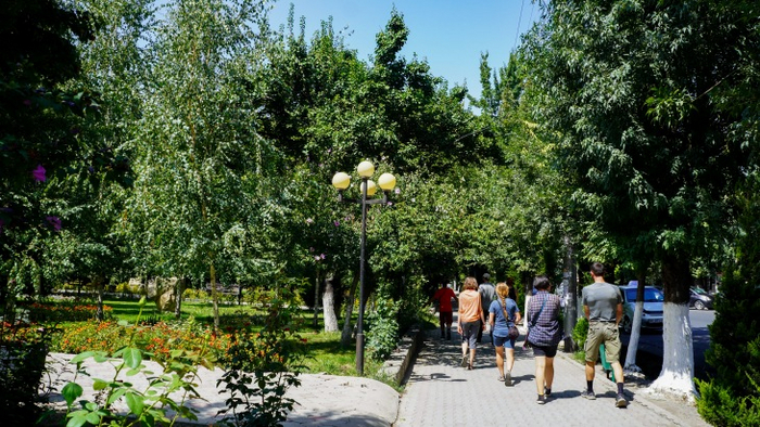 Боль в пальцах не проходила, поэтому я передвигался с трудом. По дороге расспрашиваю Диану немного о том, чем живет город. Она подтвердила мои опасения, что в городе ликвидированы крупные предприятия, а население преимущественно работает в сфере малого и среднего бизнеса, предоставляющего услуги. Много молодежи уезжает, прежде всего в Бишкек, а затем - в Россию. Ее саму, скорее всего, ждет та же участь переезда, хотя она не очень хочет расставаться со южной столицей Киргизии.