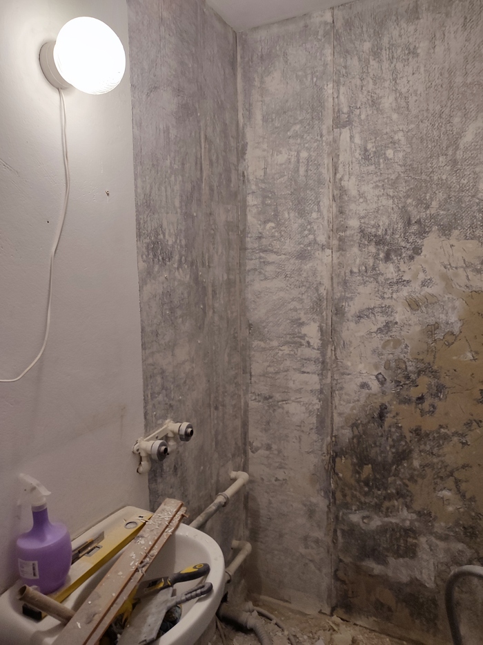 Предыстория следующая: живем на съемной квартире с женой и детьми. Ремонт "от застройщика": санузел просто покрашен водоэмульсионкой. И каждый год было одно и тоже: весной/ранним летом я скалывал часть краски с плесенью и белил заново, попутно меняя бордюрную ленту на ванной. И меня это несколько достало.