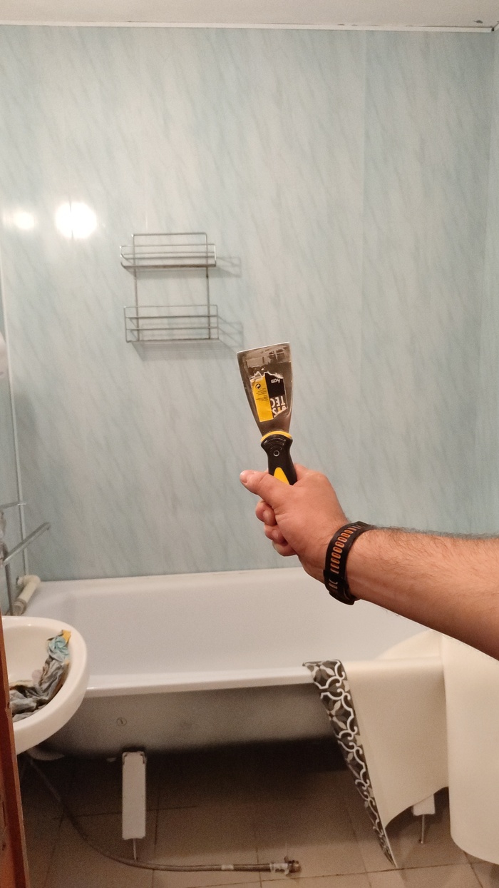 Далее аккуратно но сильно берем и стираем покрытие со стен по периметру ванной: