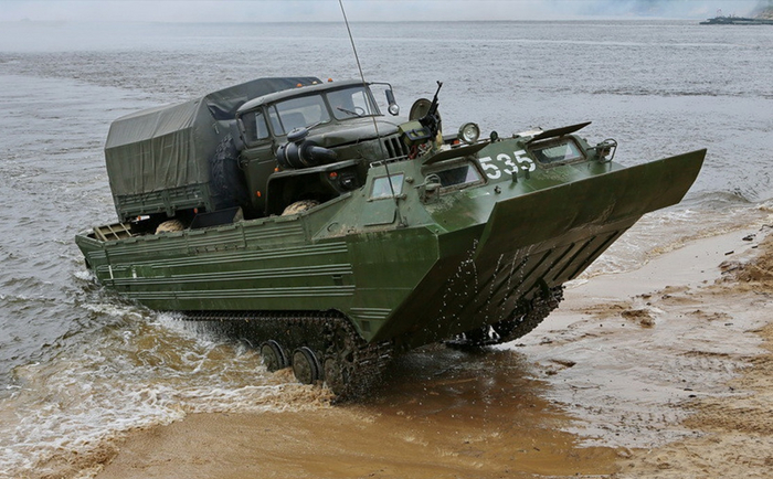 Но не только одними плавающими БТР и БМП обходятся боевые подразделения. Плавающий транспортер ПТС может оказать существенную помощь. Это гусеничная машина высокой грузоподъемности и достаточно быстрая на воде. Он отличается проходимостью и бронезащитой кабины, поэтому может следовать непосредственно за передовыми подразделениями, пусть и не прям в их рядах, а значит будет быстро подтянут. При этом спектр условий, при которых он может переправляться и выходить на берег, шире, чем у БТР и БМП, в частности по углу выезда. То есть, он может выйти на берег там, где БТР или БМП не выйдет. Одновременно с этим, ПТС оснащен оборудованием для самоокапывания, что позволяет ему, выйдя на плохо подготовленный берег, не только доставить первую партию работников, но и провести там земляные работы. В общем, обнаружив не совсем подходящий берег, армия не будет стоять, разводя руками, а возьмется за скорейшее его приведение в подходящий вид. И да, это всё ещё намного быстрее, чем ждать подхода понтонов. В дальнейшем ПТС может помочь со снабжением, переправляя тыловые подразделения. Он может перевозить в себе груженый грузовой автомобиль массой до 12 тонн, а обратным рейсом забрать раненых.