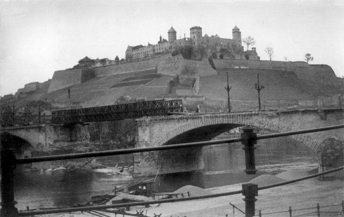 Сборный мост, установленный через разрушенный пролет капитального моста в городе Вюрцбург