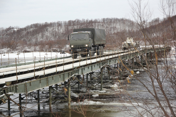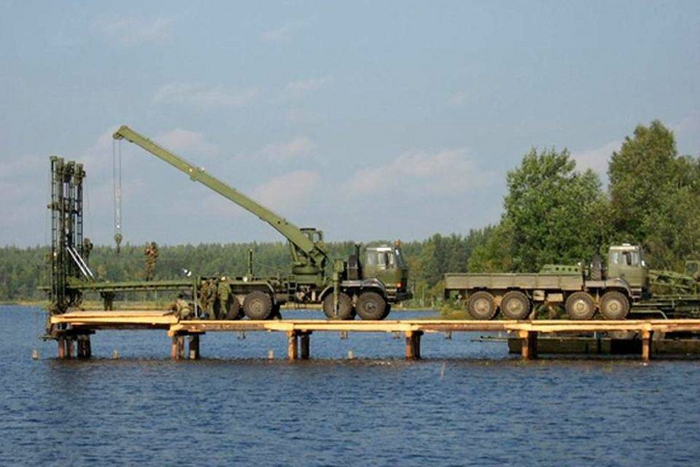 Однако, водные преграды бывают и не очень большие. Было бы странно перед каждой речушкой, оврагом, балкой, или даже каналом останавливаться и ждать, пока приедут понтонеры, мостостроители и паромщики. Сила в маневре, а значит маневр этот нужно обеспечить. В том числе это помогает сделать механизированный мост. Механизированный мост – это готовый мост, поставленный на транспортное средство и устанавливающийся с применением приводных механизмов прямо с машины. В частности, к таким мостам относятся ТММ-3 на базе КрАЗа и модернизированный вариант ТММ-6 на базе колесного тягача МЗКТ. В комплект моста ТММ-3 входят четыре машины, каждая с секцией длиной 10,5 метров. Секции имеют промежуточные опоры и устанавливаются одна за другой, позволяя преодолевать препятствие шириной в 40 метров. При этом однопролетный мост устанавливается буквально за 11 минут. Полный комплект за 75 минут. У комплекта ТММ-6 секции намного длиннее – 17 м, и общая длина препятствия соответственно увеличена. Комплект ММК устанавливается на длину в 40 м, но уже не за 75 минут, а за 45. Грузоподъемность таких мостов – 60 т. То есть, как видите, небольшое препятствие такие машины позволяют преодолеть очень быстро. Но поскольку такие машины небронированные и передвигаются на колесном шасси, применять их можно только по дорогам и вне боя.