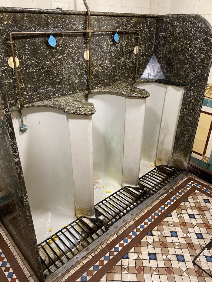 Надо сказать, что как экстерьер, так и внутреннее наполнение выглядят обычно максимально исторически, вплоть до работающего камина и писсуара столетней давности.