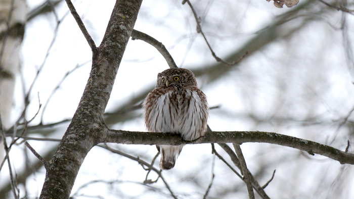 Это воробьиный сычик, сова высотой всего около 15 см. Эти хищники активны и днём. В начале марта уже можно услышать брачный свист самца воробьиного сычика — в том числе, и в светлое время. Песней самец привлекает невесту на свою территорию — где они и продолжат свой род. Сычики образуют крепкие стабильные пары. Самец — преданный семьянин. Будет заботливо помогать самке выращивать потомство. Его брачные звуки привлекают не только самку, но и фотографов дикой природы. Именно по песне они, чаще всего, и находят в нашем городе эту крошечную сову. Для петербургских фотографов это большая удача. Ведь в нашем городе гнездится всего около десяти пар воробьиных сычиков. Воробьиный сычик занесён в Красную книгу Петербурга
