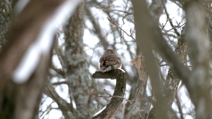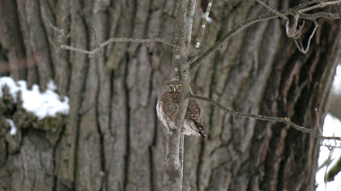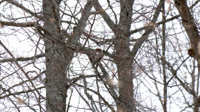Это воробьиный сычик, сова высотой всего около 15 см. Эти хищники активны и днём. В феврале уже можно услышать брачный свист самца — в том числе, и в светлое время. Песней самец привлекает невесту на свою территорию — где они и продолжат свой род. Сычики образуют крепкие стабильные пары. Самец — преданный семьянин. Будет заботливо помогать самке выращивать потомство. Его брачные звуки привлекают не только самку, но и фотографов дикой природы. Именно по песне они, чаще всего, и находят в нашем городе эту крошечную сову. Для петербургских фотографов это большая удача. Ведь в нашем городе гнездится всего около десяти пар воробьиных сычиков.