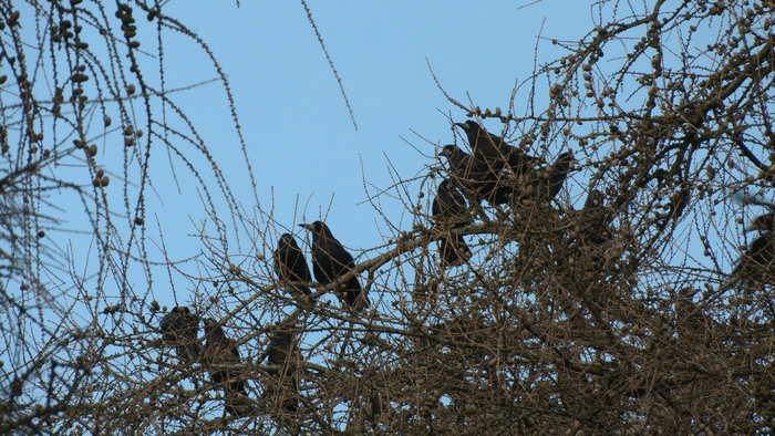 Грачи гнездятся большими колониями, которые называются грачевниками. В одной колонии может жить несколько сот пар, а в кроне одного дерева могут располагаться десятки гнезд. Грачевники располагаются на высоких деревьях: березах, тополях или - как колония, которую я снял на территории памятника природы "Дудергофские высоты"- на лиственницах. Колонии грачей постоянны, на одних и тех же местах они существуют в течение многих десятилетий. Первые две-три недели после прилёта в колонии грачей особо шумно: птицы активно делят между собой гнезда. Ведь используют они их по многу лет, а каждую весну обновляют и достраивают.