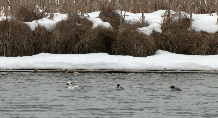 Второе название этих уток — малые крохали. Мне удалось повстречать четырёх лутков: одного самца и трёх самок. Это небольшая уточка. Самец — селезень — выделяется белоснежной окраской, чёрной маской вокруг глаз и двумя чёрными косичками на затылке. Самки выглядят более скромно: у них каштановая голова с белыми щёчками, а тело — буроватого цвета. Эти пернатые встречаются в наших краях только во время миграций, по пути к местам гнездования, в лесотундру. Крайне редко одиночные птицы по каким-то причинам остаются у нас зимовать — как и этот красавец с тремя дамами! Пролёт лутков начнётся не раньше, чем через месяц.