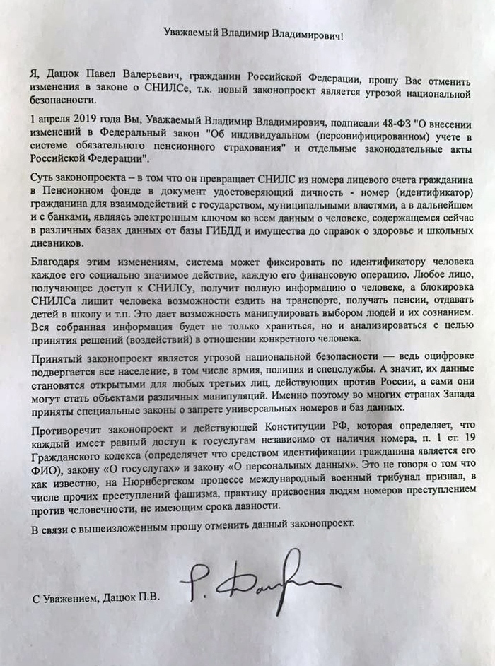 Дацюк обратился к Путину с протестом против закона о СНИЛС