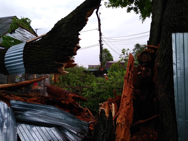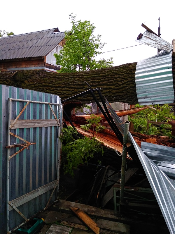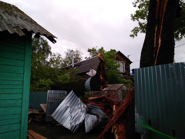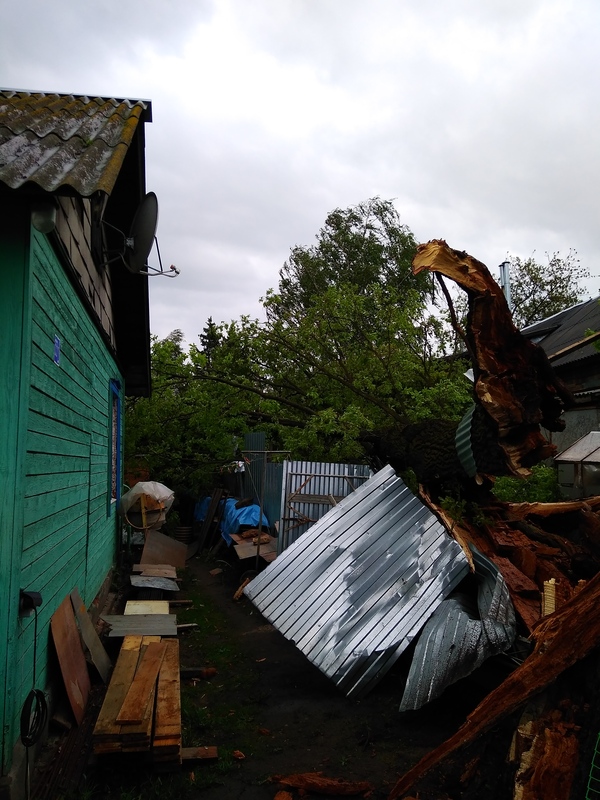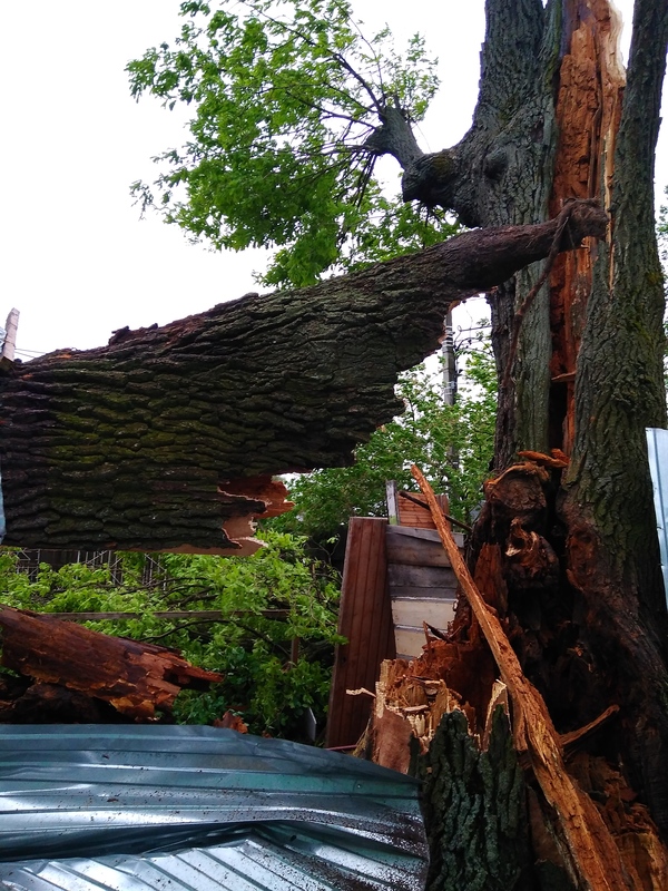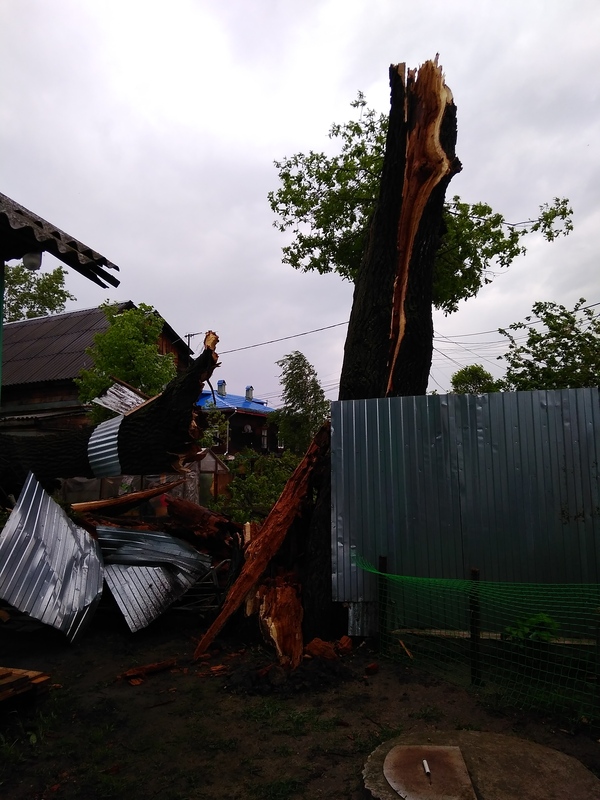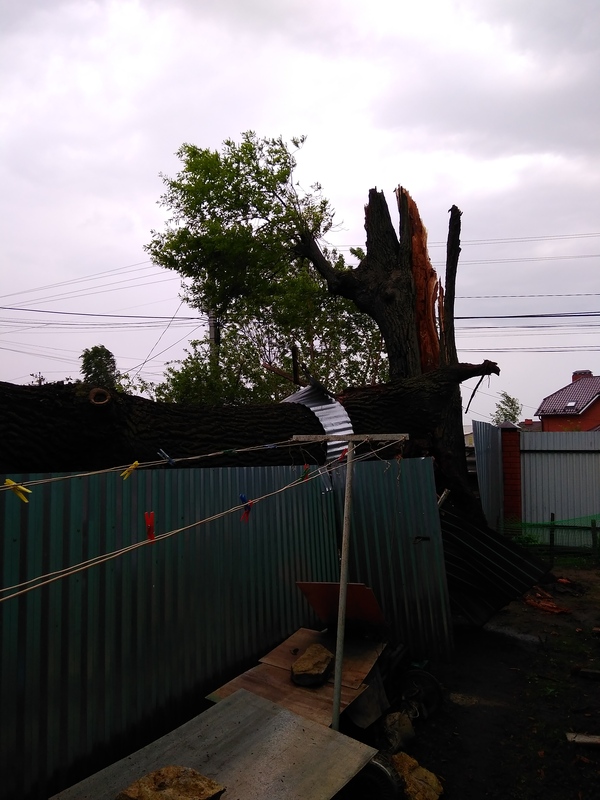В тему сегодняшней непогоды. У меня во дворе упал старый дуб. Невероятно повезло, что упал он между домами. Погнул два столбика и три листа у забора.