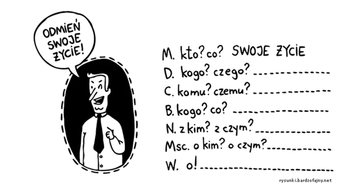 WOŁACZ [воЛАЧ] Звательный падеж (лат. vocativus) — здесь нет вопросов. Это особый случай, поскольку он не указывает на какие-либо отношения в высказывании. Это всего лишь форма существительного, используемая в функции обращения к другим людям. Используется в восклицаниях и прямых обращениях. В настоящее время его заменяет именительный падеж — мы чаще слышим крик Bartek, чем Bartku! Во многих словах именительный и звательный падежи имеют одинаковую форму.