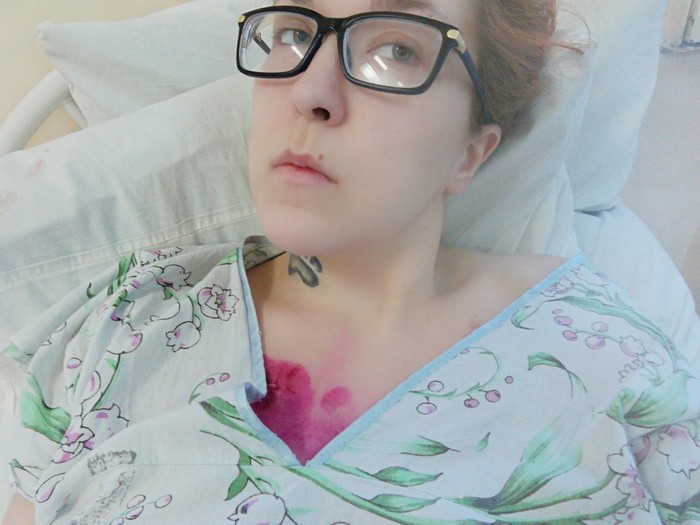 Утро начиналось с перевязки, перед сном тоже перевязывали, и все равно рана стремительно опухала, с каждым днем все круче и круче, а при нажатии на область рядом издавала звук "чпок" и между стежками пролезал гной. Ночью я спала со свежей перевязкой, и все равно утром мне меняли всё: перевязку, ночную рубашку, халат, простынь, наволочку - все было в гное. Вставал вопрос о переводе обратно, тем более, что психиатры единодушно пришли к выводу, что настолько тупым нужно давать премию Дарвина, а не справку из ПНД.