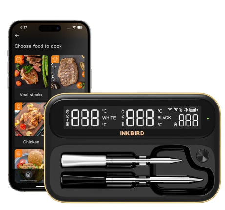 Цифровой термометр помогает контролировать температуру приготовления мяса. Беспроводное подключение позволяет отслеживать данные на расстоянии.