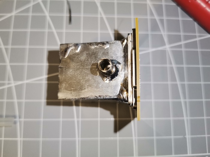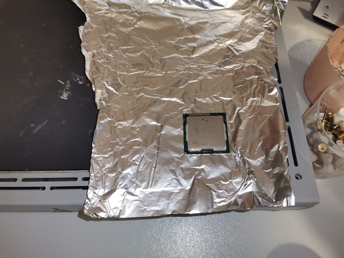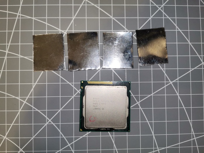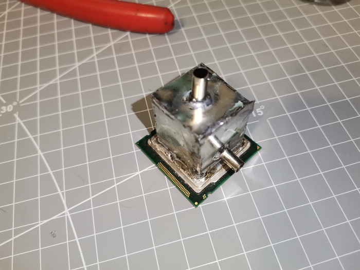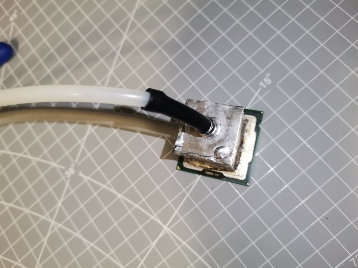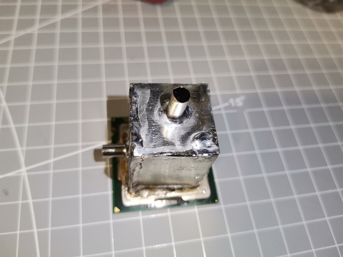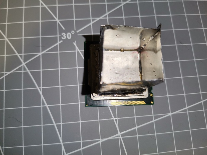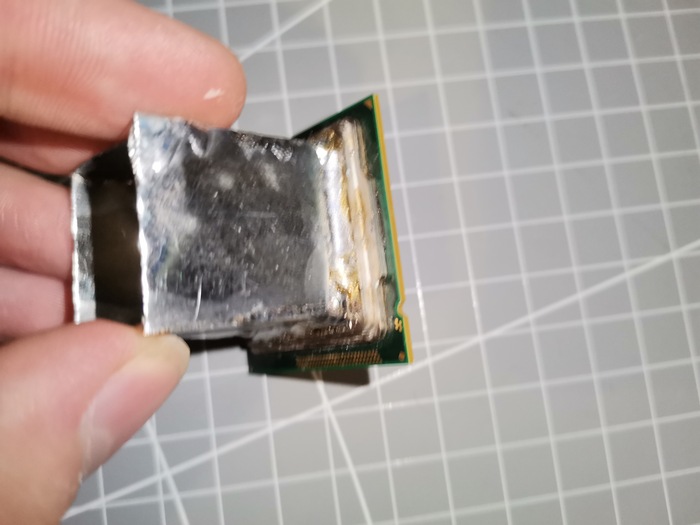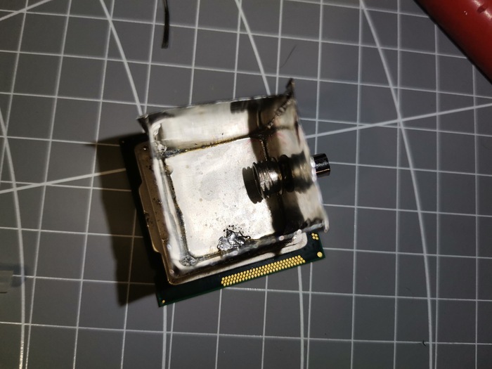 Теперь нужно припаять к процессору ранее вырезанные кусочки металла. Надо припаять герметично, чтобы не протекала вода на плату.