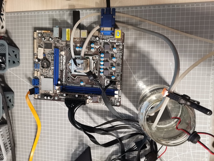 Вставляем процессор в материнскую плату и надеемся что всё заработает. Подключаем помпу и наливаем воду.