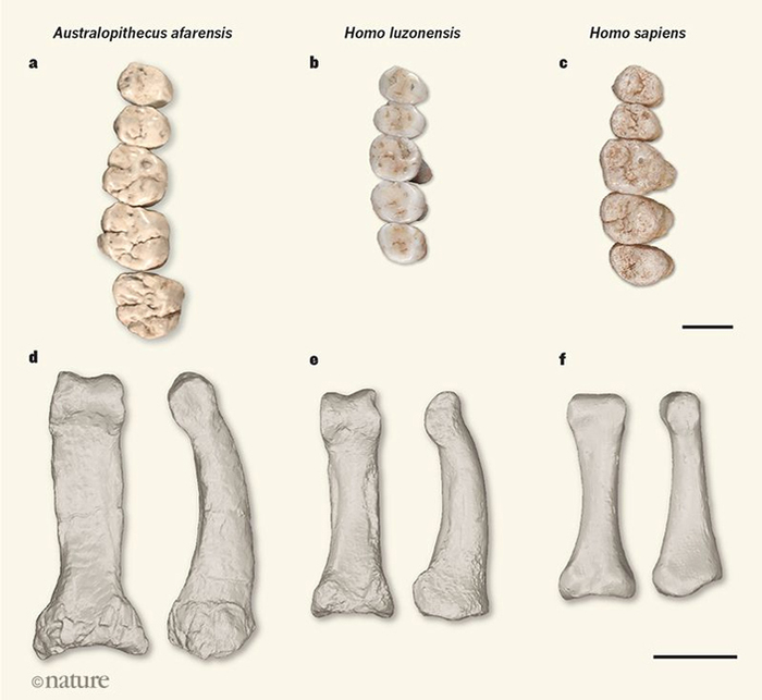 Рис. 4. a–c — премоляры и моляры афарского австралопитека (индивид возрастом 3,4 млн лет из Эфиопии), H. luzonensis и архаичного H. sapiens (Израиль, возраст 177 000 лет, см.: I. Hershkovitz et al., 2018. The earliest modern humans outside Africa). d–f — проксимальные фаланги пальцев ног афарского австралопитека (3,2 млн лет, Эфиопия), H. luzonensis и современного сапиенса (1800-е годы, Филиппины). Длина масштабных отрезков — 1 см. Изображение из популярного синопсиса М. Точери (Matthew W. Tocheri) к обсуждаемой статье в Nature